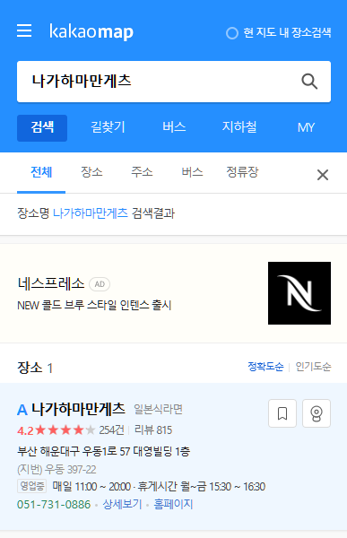 해리단길 나가하마만게츠는 카카오맵으로 봤을 때 254건의 별점에 4.2점이므로 맛집 가능성이 아주 높다고 볼 수 있다.