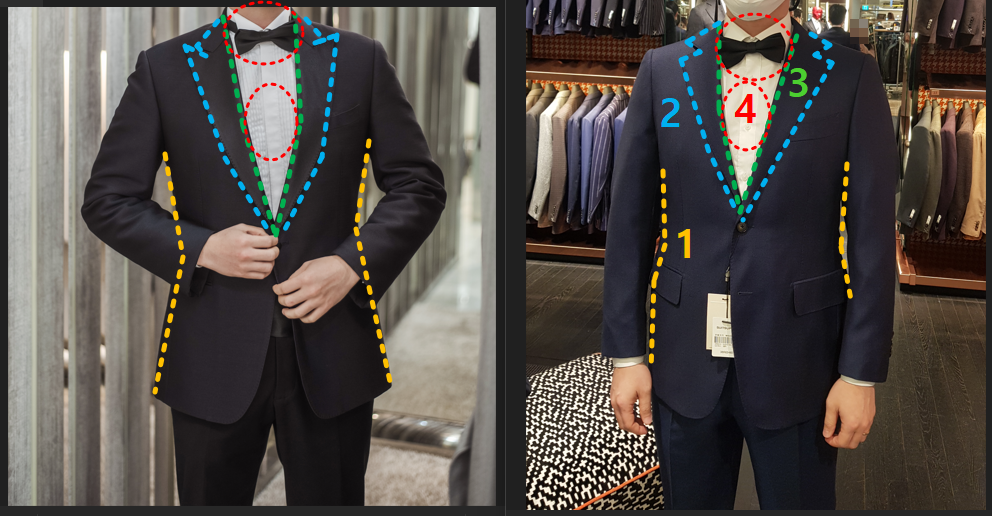 잘 보면 일반 정장과 턱시도는 4군데 정도 차이가 난다.