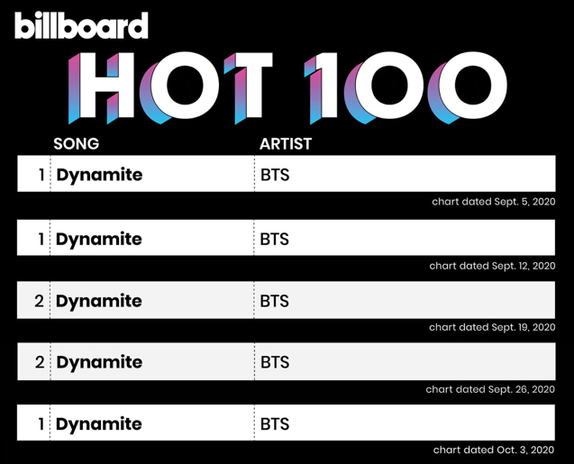 - 2020년 9월 1일: 다이너마이트 빌보드 핫100 1위 달성 (이후 5주간 1~2위 유지)