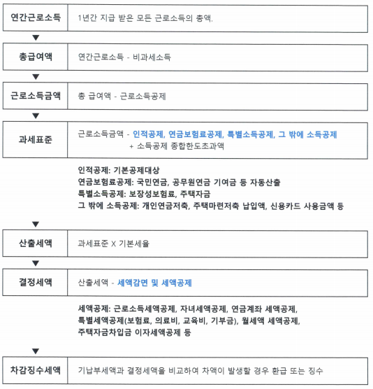 3) 과세표준의 파란글씨가 바로 근로자가 신경쓸 수 있는 부분이다. 연금보험료는 급여에서 원천징수되는 4대보험료이기 때문에 역시 신경쓸 것이 없지만 그 외에 기본공제, 특별소득공제, 그 밖에 소득공제는 꼼꼼하게 챙겨야한다.