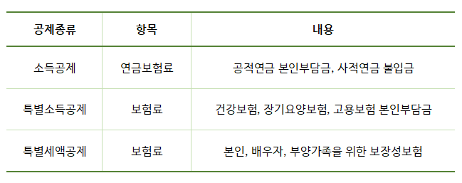 - 국민연금: 실제 납부한 과세기간에 한해 공제