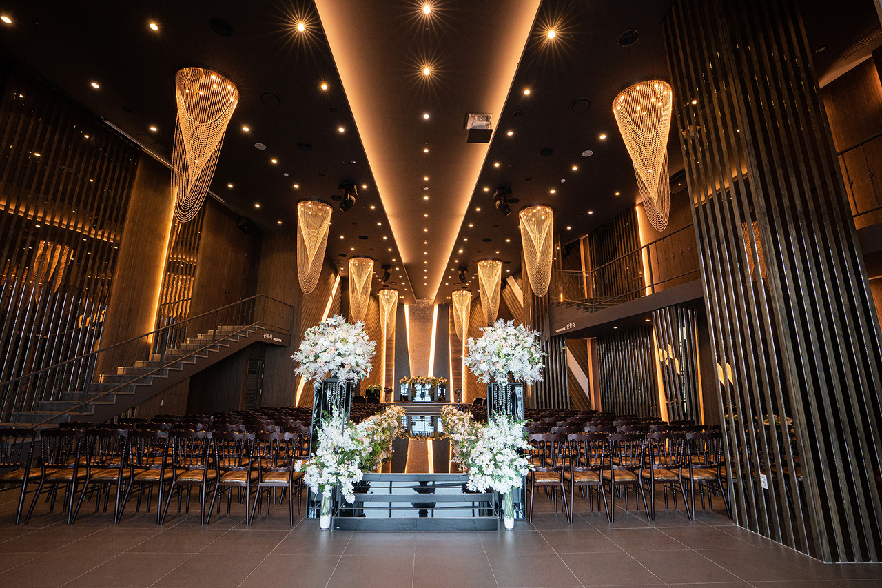 - 1층 컨벤션홀 중간에 큰 기둥이 있고 웨딩로드가 활처럼 휘어짐