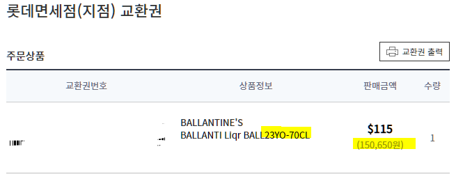 발렌타인 23년산 결제가는 115달러(150,650원)