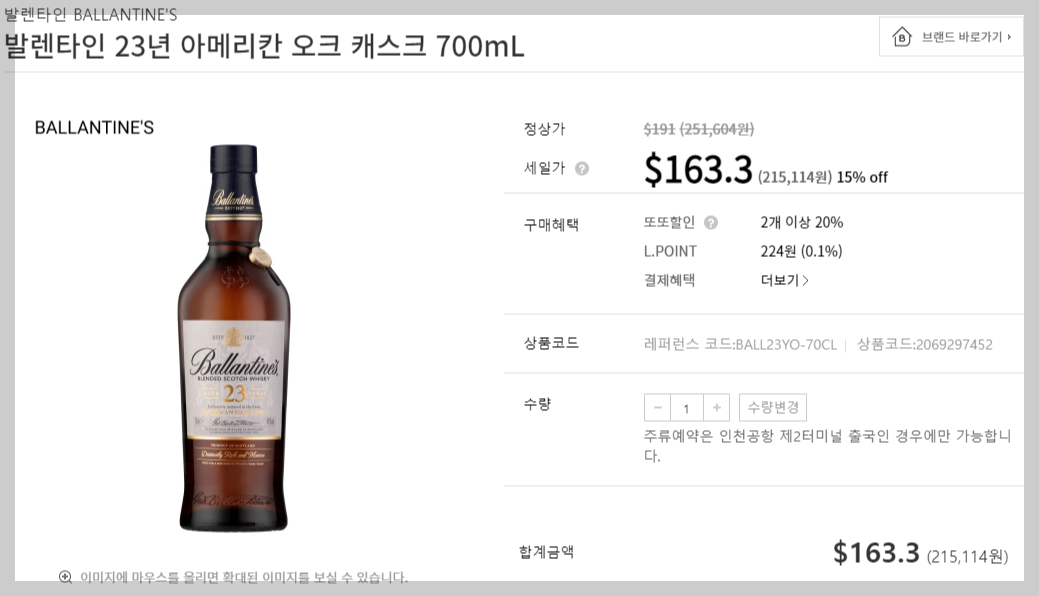 발렌타인 23년산 정상가 191달러(251,604원) : 인터넷 15% 할인 163.3달러(215,114원)