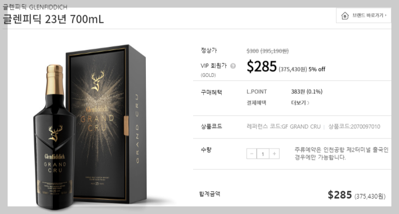 글렌피딕 23년산 정상가 300달러(395,190원) : 인터넷 5% 할인 285달러(375,430원)