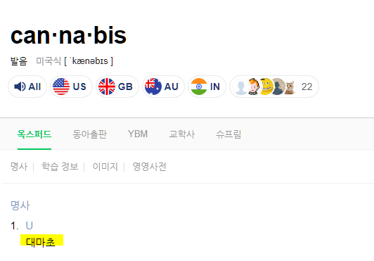 영어표기인 cannabis와 marijuana, marihuana(마리화나) 정도는 외워두는 게 좋을 듯하다.