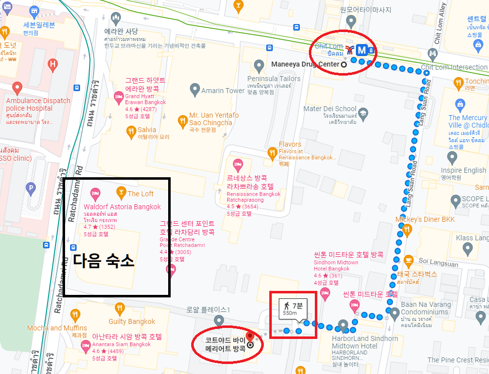 첫번째 숙소인 코트야드는 칫롬에서 걸어서 7분 정도 거리에 위치해 있는데,