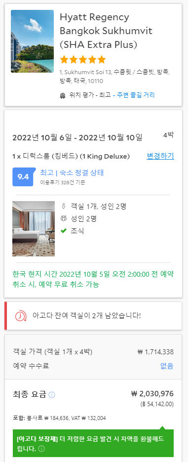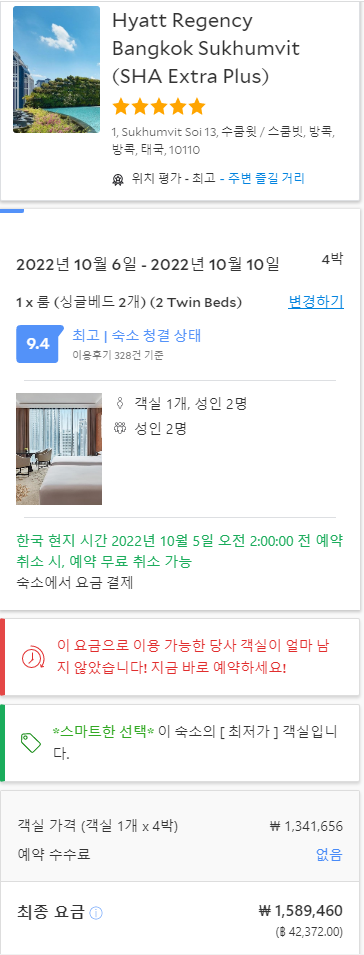 하얏트 리젠시 방콕 수쿰빗 호텔 4박 (53만원)을 취소하고,