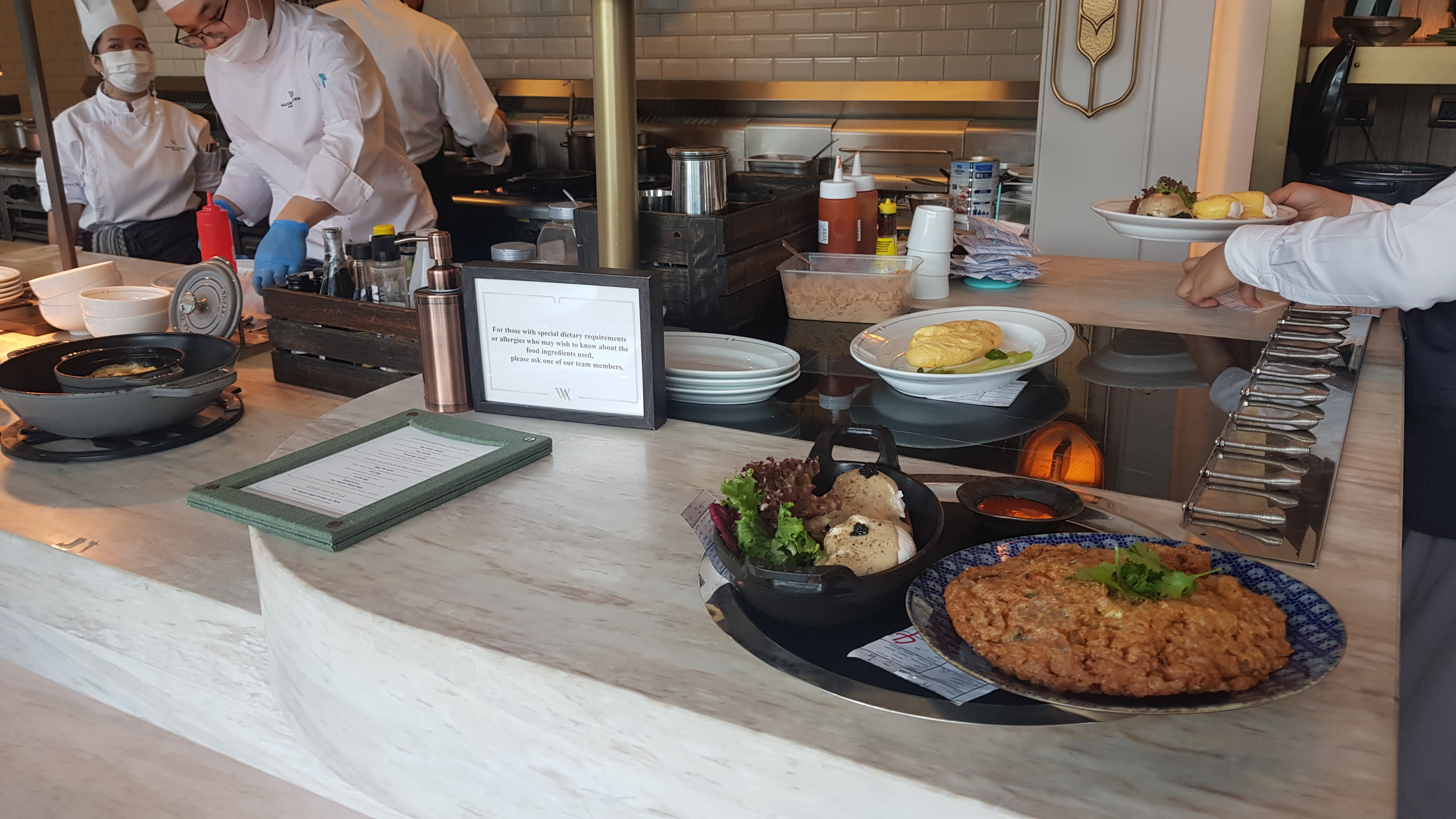 기본적으로 월도프는 즉석요리든 뭐든 뷔페식으로 당장 주워담는 음식이 아니고, 손님이 잠깐이라도 기다려야하는 경우 손님을 스테이션 앞에 세워두지 않고, 직원이 인상착의를 기억한 뒤 손님의 자리로 가져다 준다.